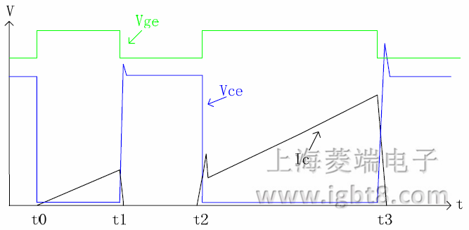 在t0時(shí)刻,門(mén)極放出第一個(gè)脈沖,被測(cè)IGBT 飽和導(dǎo)通,電動(dòng)勢(shì)U加在負(fù)載L上,電感的電流線性上升,電流表達(dá)式為: